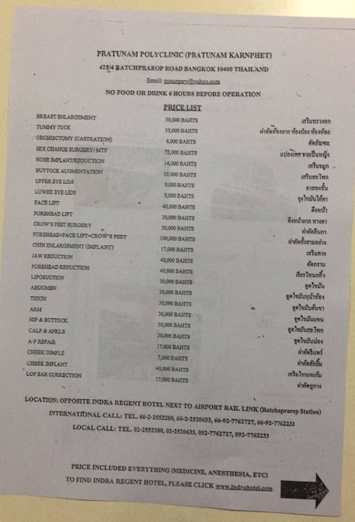 Pratunam Polyclinic provides healthcare to trans people, including local Thai girls, at rates far lower than any other reputable surgeon in the country.